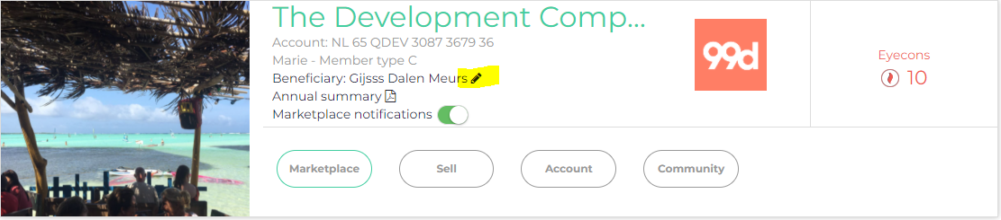 Als laatste stap moet je de correcte Beneficiary linken aan je account. Dit doe je in je dashboard. Als je op het geel gemarkeerde pennetje (zie afbeelding) klikt dan krijg je alle aangemaakte beneficiaries te zien, en selecteer je de correcte.